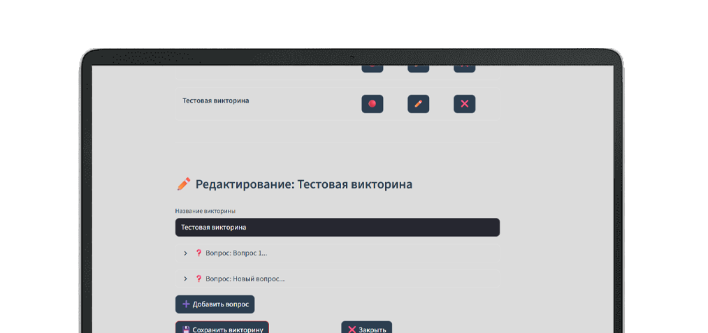 Викторины — Администратор создает викторину, добавляя вопросы с несколькими вариантами ответов. — Каждому варианту можно назначить определенное количество баллов. — Участники отвечают на вопросы последовательно, выбирая один вариант на каждый вопрос. — По окончании викторины бот показывает итоговый результат участника и общий рейтинг всех прошедших опрос. — Результаты сохраняются и доступны для анализа в админ-панели.